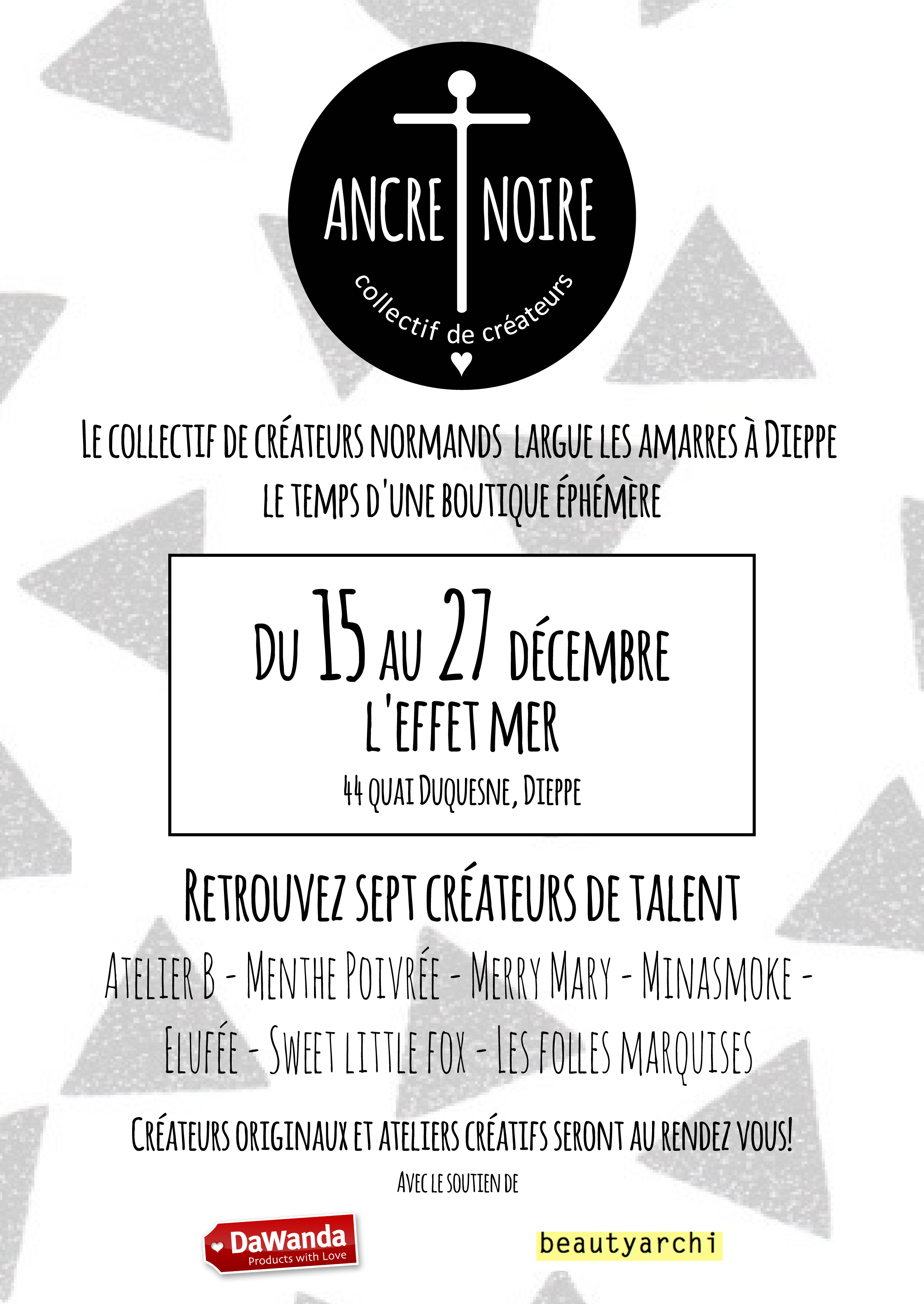 •Du 15 au 27 Décembre : boutique éphémère avec le collectif ANCRE NOIRE (Boutique L ‘effet mer situé au 44 rue duquesne) DIEPPE